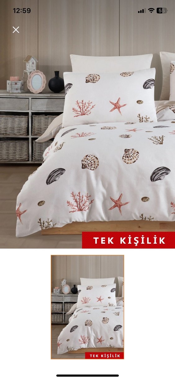 Beyaz zemin üzerine deniz kabukları ve denizyıldızı baskılı, tek kişilik nevresim takımı. Hafif renkli ve yumuşak dokuludur.