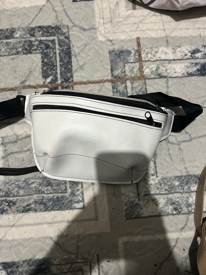 Beyaz deri, kemerli ve fermuarlı cepli bu çapraz çanta, sokak modasına uygun ve günlük kullanıma elverişlidir. marka temsili