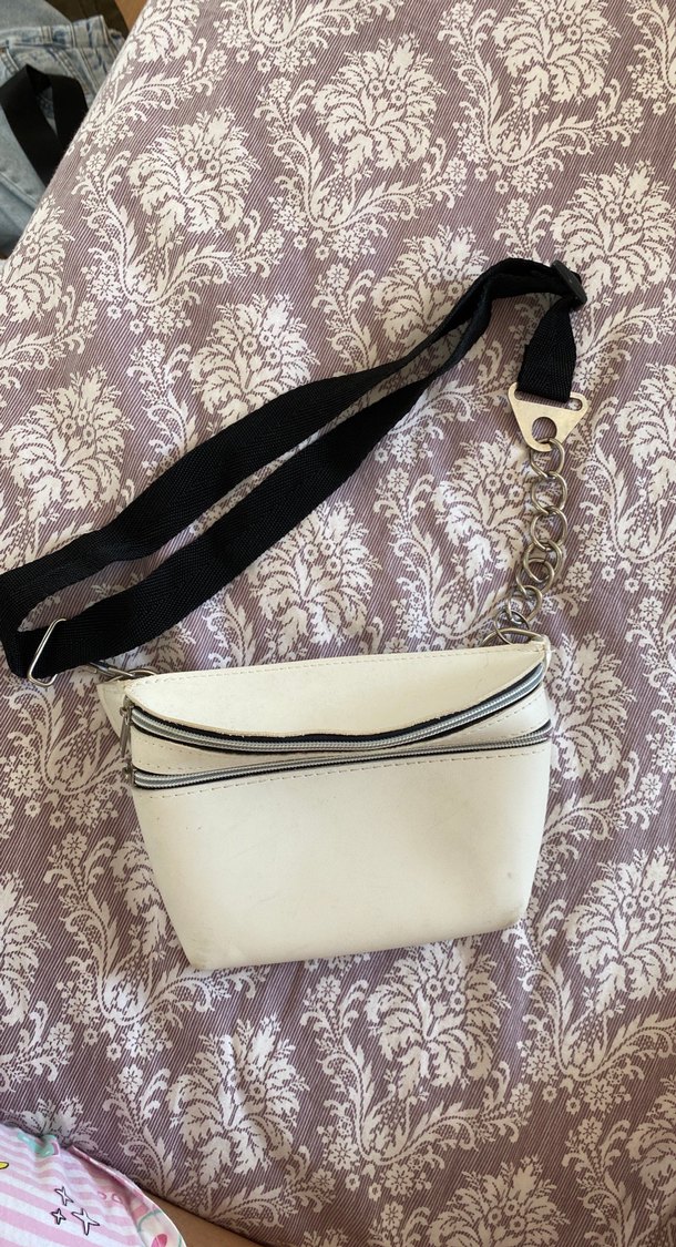 Siyah ayarlanabilir askılı, fermuarlı bölmeli beyaz deri bel çantası, günlük kullanıma uygun.Çantanın üstünde bazı yerlerin de çizikler mevcuttur kullanışlı bel çantasıdır