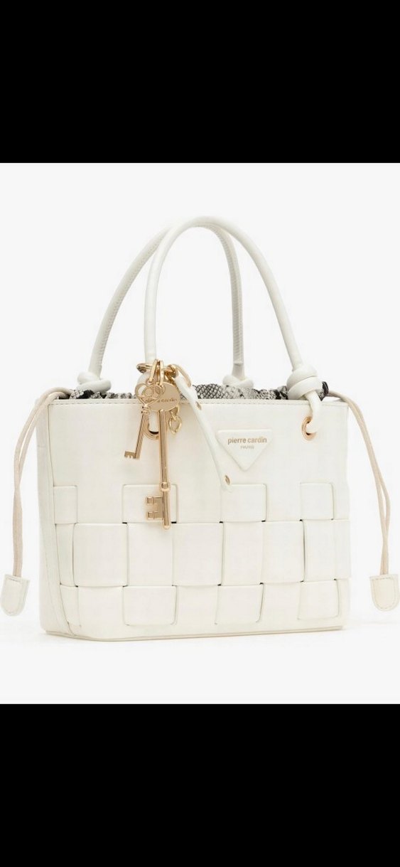 Pierre Cardin'in modern klasik tarzında, zincir detaylı beyaz deri kadın çanta. Kare desenli ve günlük kullanıma uygun.