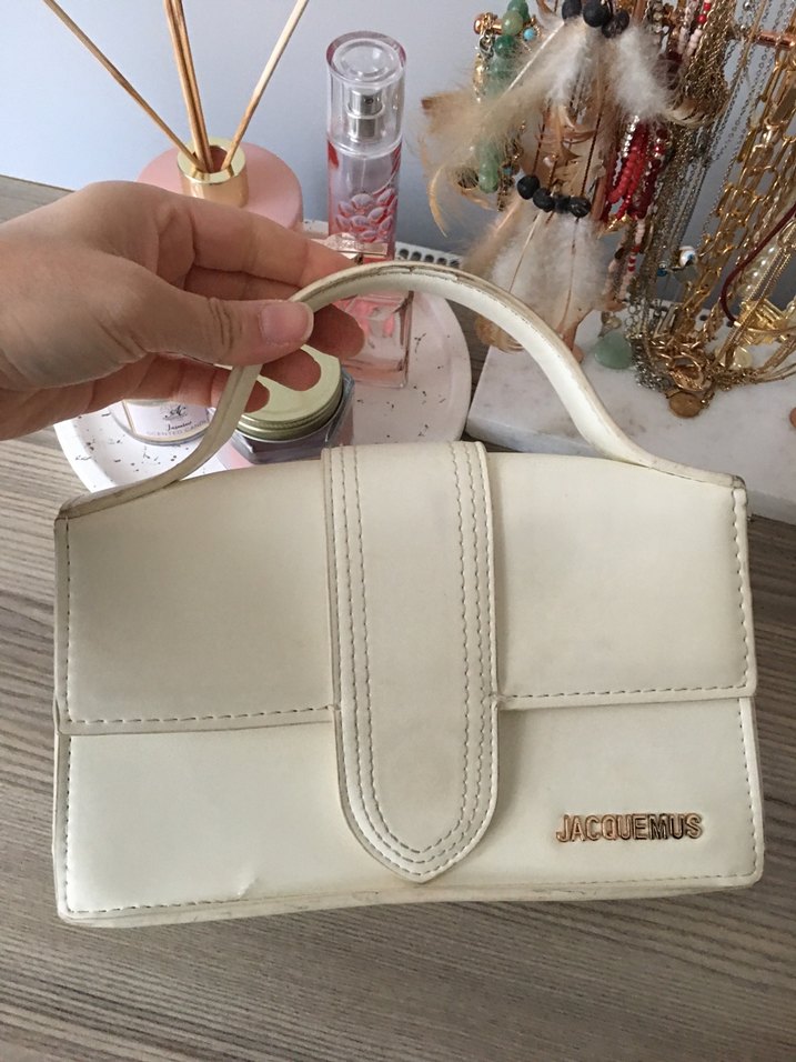 Beyaz deri, tokalı üst saplı bohem tarzda kadın el çantası. Düz yüzeyli, pastel tonlarda ve JACQUEMUS marka etiketli.