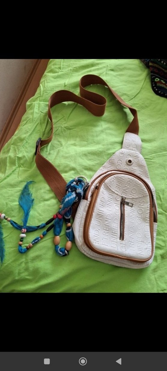 Beyaz deri çapraz çanta, tokalı kayış ve batik desen detaylarına sahip. Ön fermuarlı cep ve boncuk süslemeleriyle bohem tarzı tamamlar. minik sökük var dikilebilir.