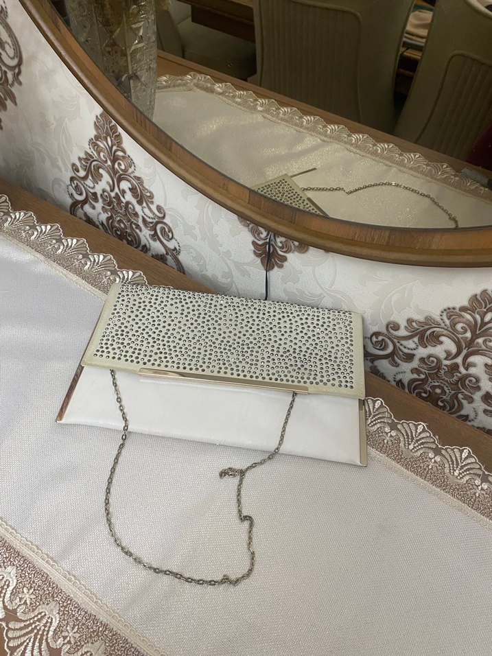 Beyaz deri portföy çanta, boncuk detaylı ve yılan derisi desenlidir. Düğünler için uygun, ince zincir askılıdır.