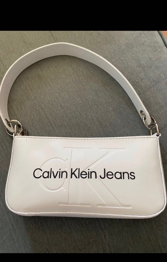 Beyaz deri kadın çanta, minimal tasarım ve tokalı askı ile. Gri Calvin Klein Jeans yazılı baskı, trend sokak stiline uygun.