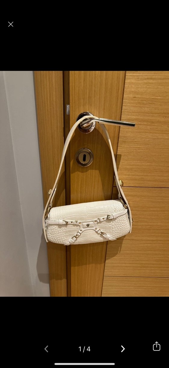Bu beyaz deri kadın çanta, yılan deseni ve tokalı detaylara sahiptir, günlük kullanım ve sokak modası için uygundur.