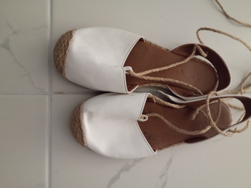 Beyaz deri dolgu topuk espadriller, minimalist ve bohem tarzı yansıtır. Rahat ve şık görünüm için günlük kullanıma uygundur.