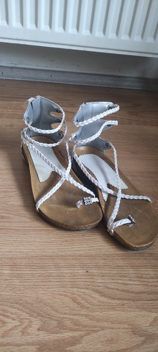 Beyaz deri, dolgu topuklu kadın sandalet. Örgülü kayışlar ve tokalı detaylarla bohem tarzını yansıtır. Gri tonlarıyla sade bir görünüm sunar.