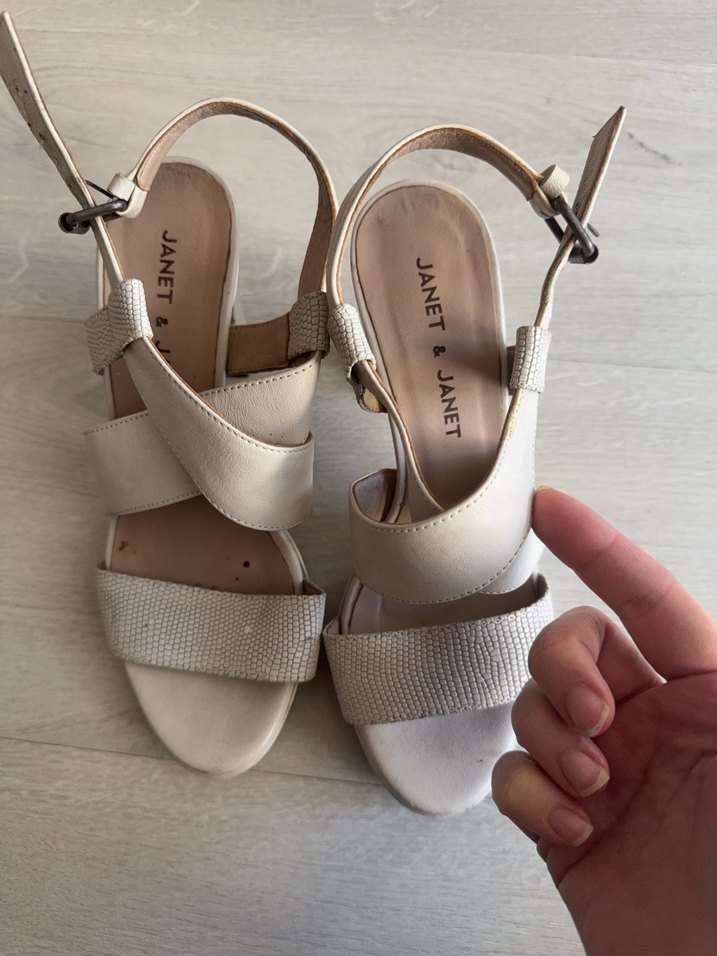 JANET&JANET markalı beyaz dolgu topuklu sandalet, bağcıklı bantlara sahip, minimalist tasarım, günlük kullanıma uygun.