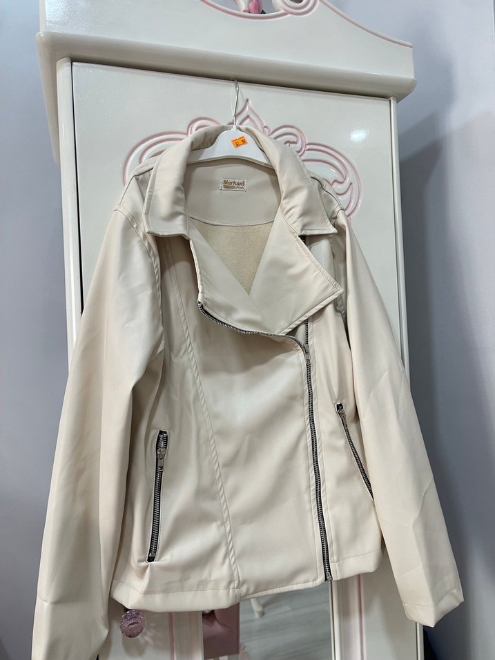 deri ceket, fermuarlı cepleri ve kesik yaka detayıyla trend bir görünüme sahiptir. Normal midi boy, uzun kollu ve günlük kullanıma uygundur. Desensiz, hafif gri tonludur.
