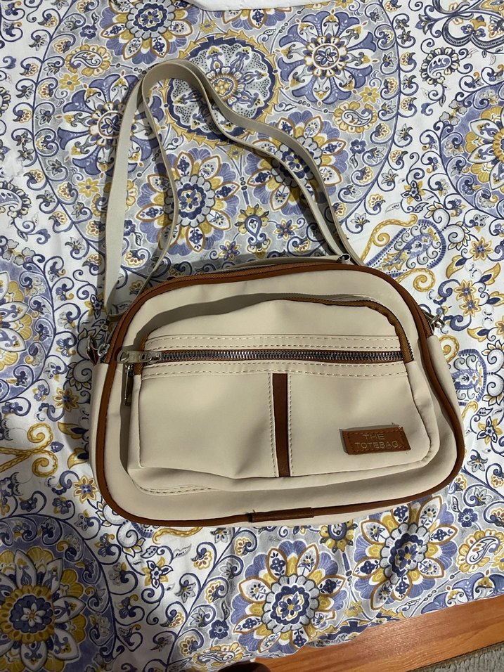 Beyaz deri, fermuarlı tasarıma sahip çanta, günlük kullanım için pastel tonlarda ve baskılı desende. Bohem ve retro ruhu yansıtıyor.