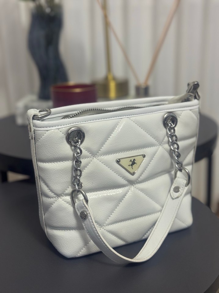 Beyaz deri, fermuarlı üst kısmı ve zincir detaylı saplarıyla Paris tarzını yansıtan, günlük kullanıma uygun şık bir kadın çantasıdır.