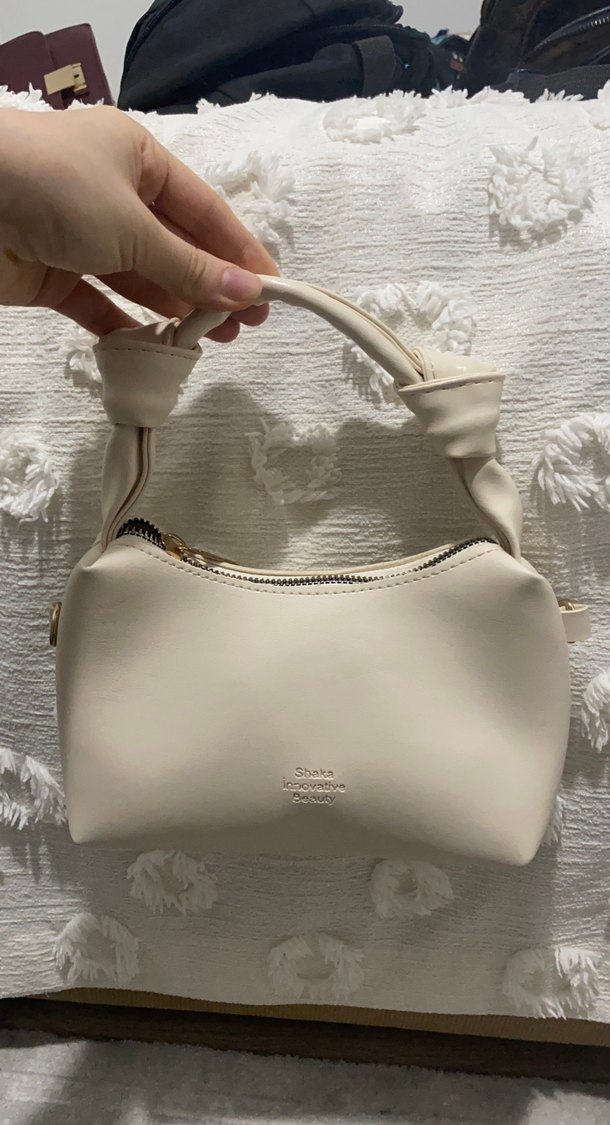 Beyaz deri fermuarlı çanta, kıvrımlı sapıyla sade ve pastel tonlarda, günlük sokak stili için uygun bir aksesuardır.