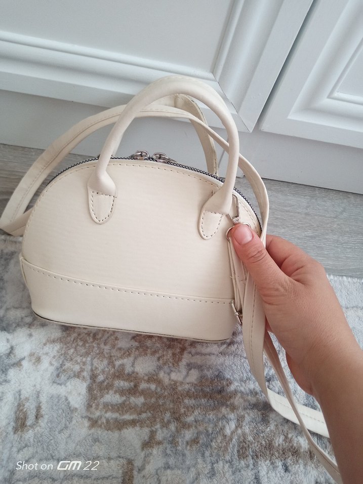 Beyaz deri fermuarlı kadın çanta, modern klasik tasarıma sahiptir. Düz yüzeyli ve sade stil, günlük kullanım için uygundur. Hem sap hem de askı bulunmaktadır.