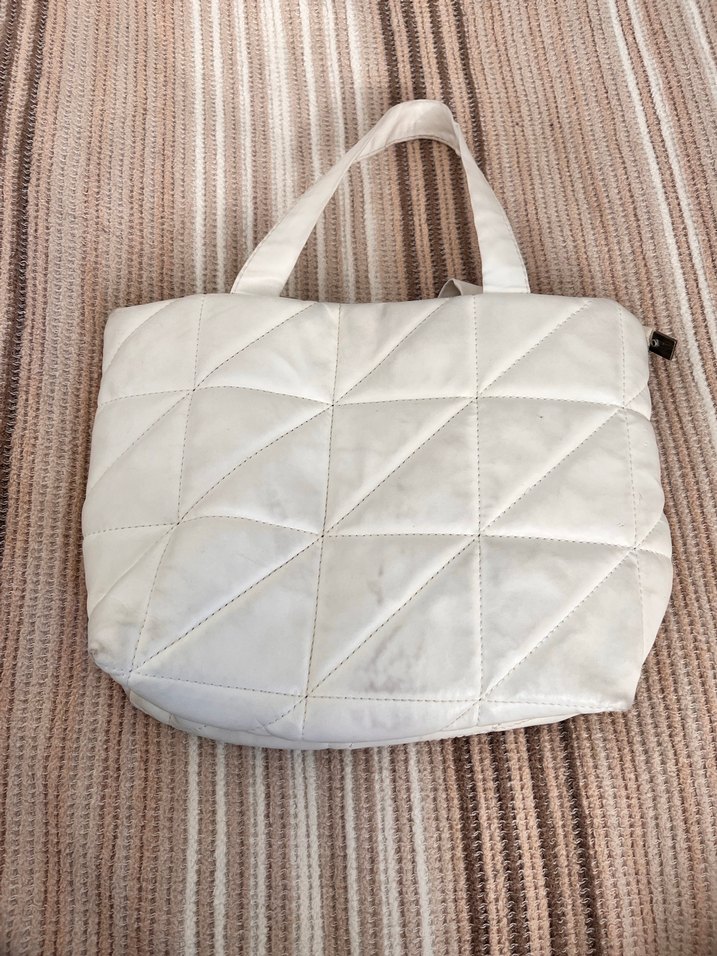 Fermuarlı kapama özelliğine sahip beyaz deri kadın çantası, günlük sokak giyimine uygun sade tasarım ve kısa kulplar içerir. Renk geçti için fiyatı uygun tutuyorum