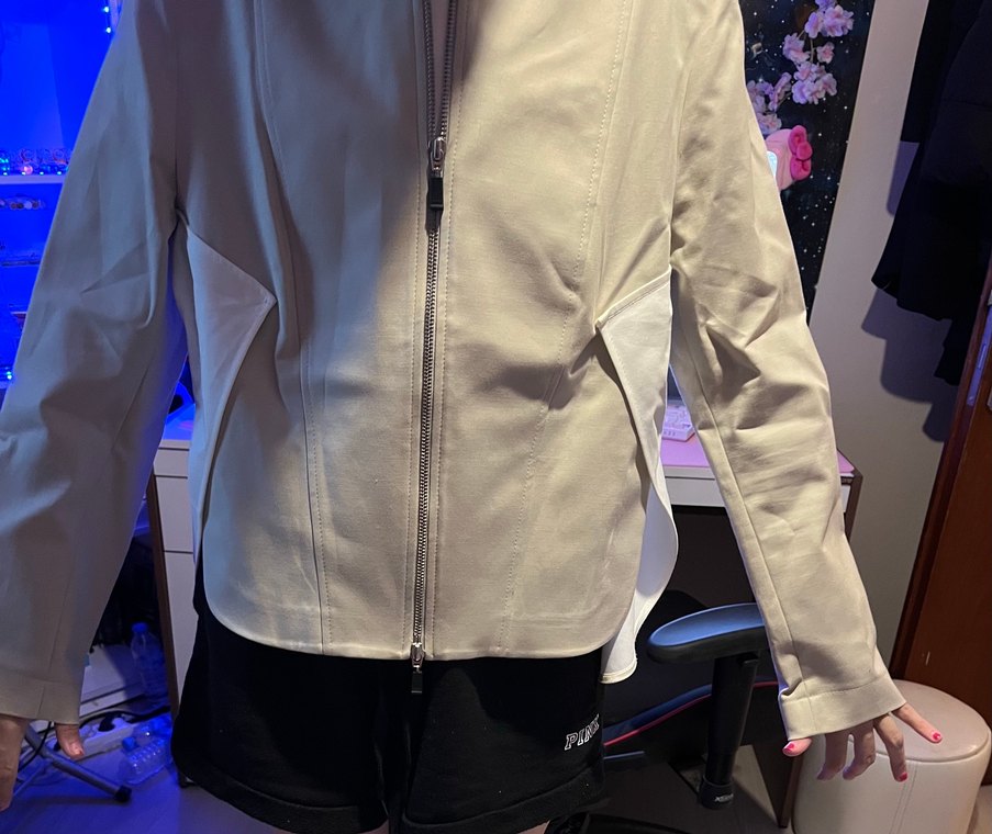 Beyaz deri, fermuarlı, uzun kollu ve normal midi boyda, kesimli kadın ceket sokak stiline uygun tasarım.