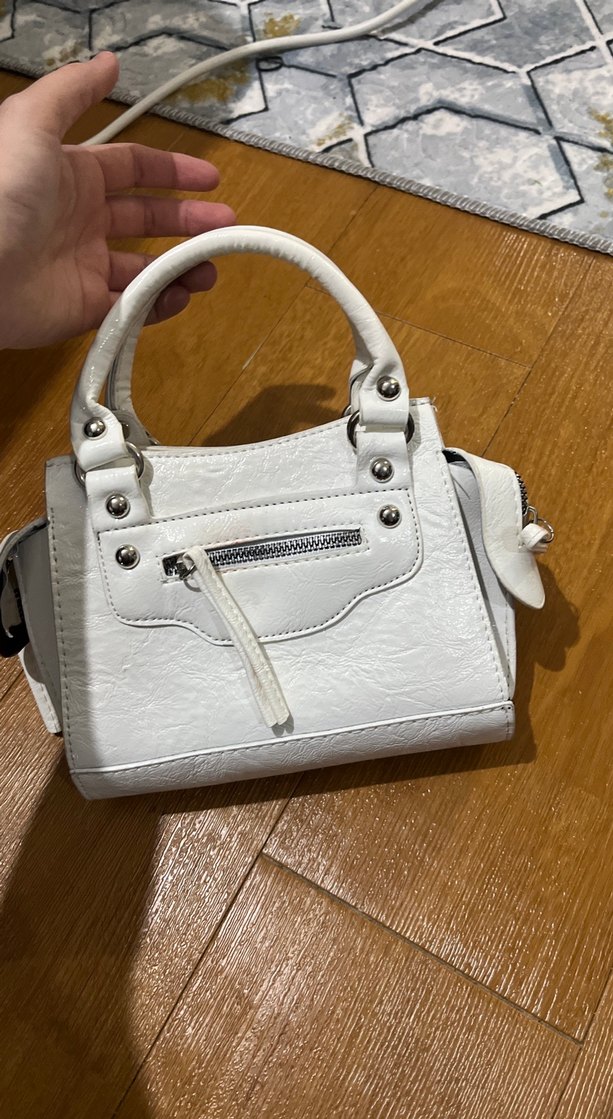 Beyaz deri, fermuarlı ön cep ve çift saplı kadın el çantası. Düz, desensiz tasarımıyla sokak stiline ve günlük kullanıma uygundur.