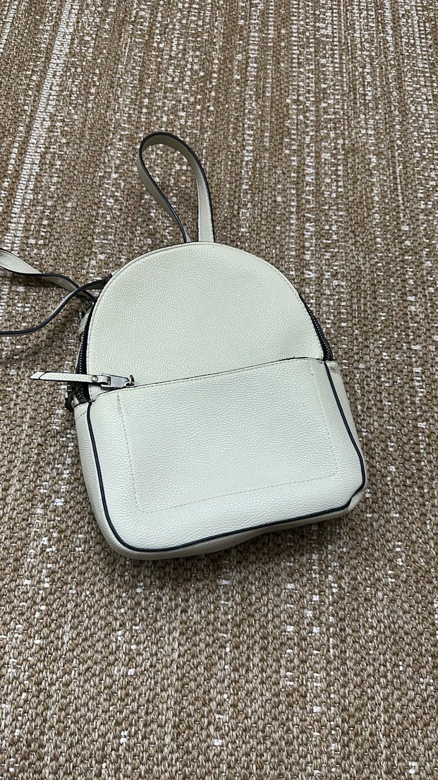 Minimalist beyaz deri sırt çantası, fermuarlı ve düz tasarımlı, günlük sokak stiline uygun.
