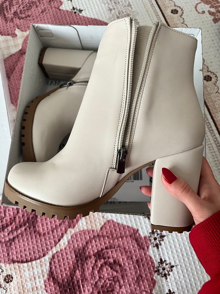Beyaz deri, fermuarlı ve kalın topuklu botlar. Düz yüzeyli, rahat tasarımıyla günlük kullanıma uygun, trend sokak stili için ideal.