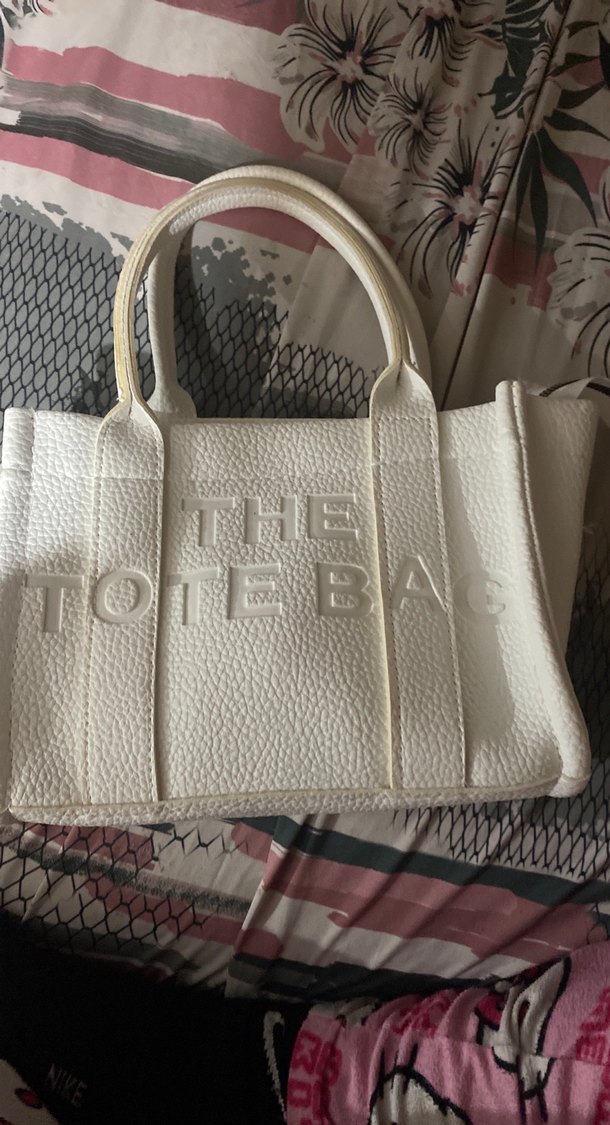 Fermuarlı beyaz deri tote çanta, baskılı desenli ve dokulu yüzeye sahip. Günlük sokak stili için uygundur.