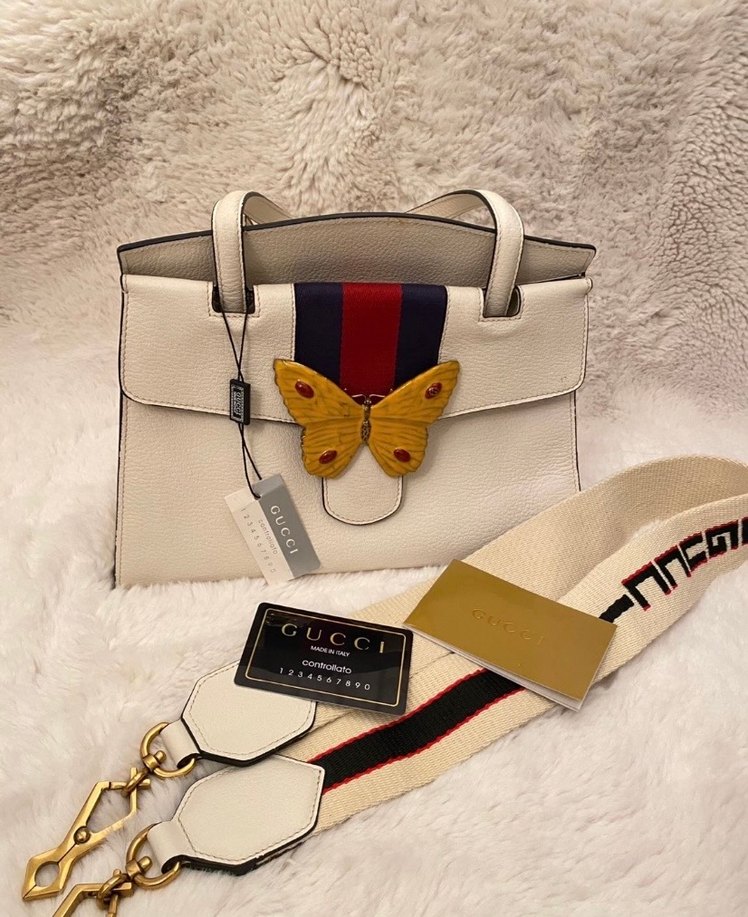 İthaldir kodlu Beyaz deri Gucci kadın çanta, kelebek desenli tokası ve çıkarılabilir kırmızı-mavi şeritli askısıyla klasik Paris sokak stilini yansıtıyor.
