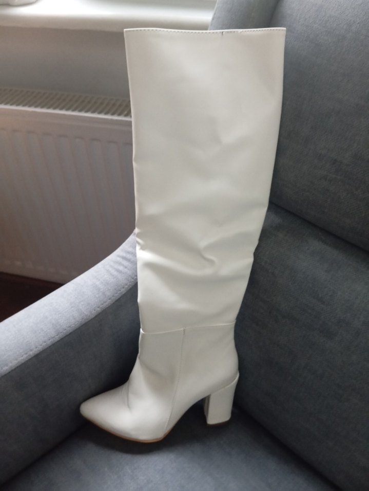 Beyaz deri malzemeden yapılmış, ince topuklu ve diz üstü uzunluğunda, minimalist ve çağdaş tarzda kadın çizmesi. kalıp olarak dar 36numaraya olur içi miflonlu hiç giyilmedi topuk boyu 9cm boyu 54