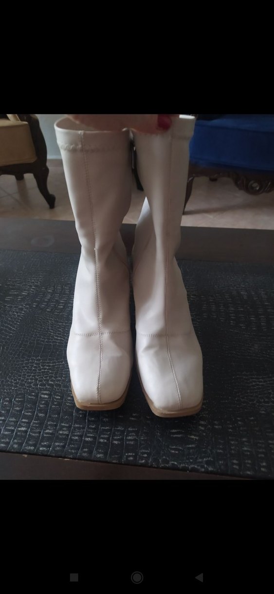 Beyaz deri kadın bot, kalın topuklu ve strech model desen içermeyen düz tasarım, şehir stiline ve günlük kullanıma uygun.