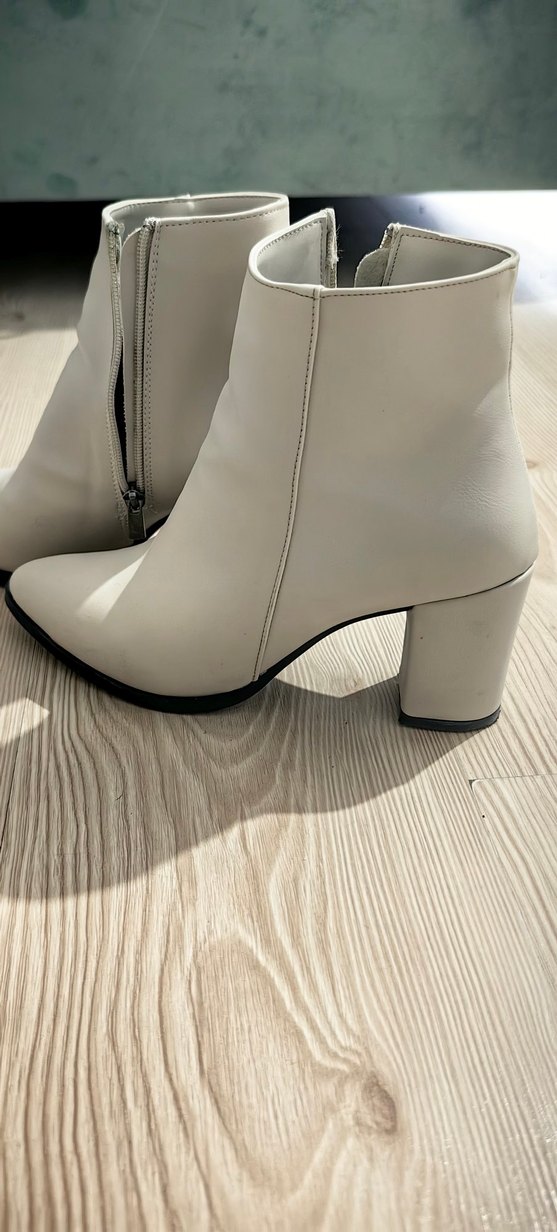Beyaz deri kadın botlar, kalın topuklu ve fermuarlı olarak tasarlanmıştır. Minimalist ve çağdaş tarzda, günlük kullanıma uygundur.