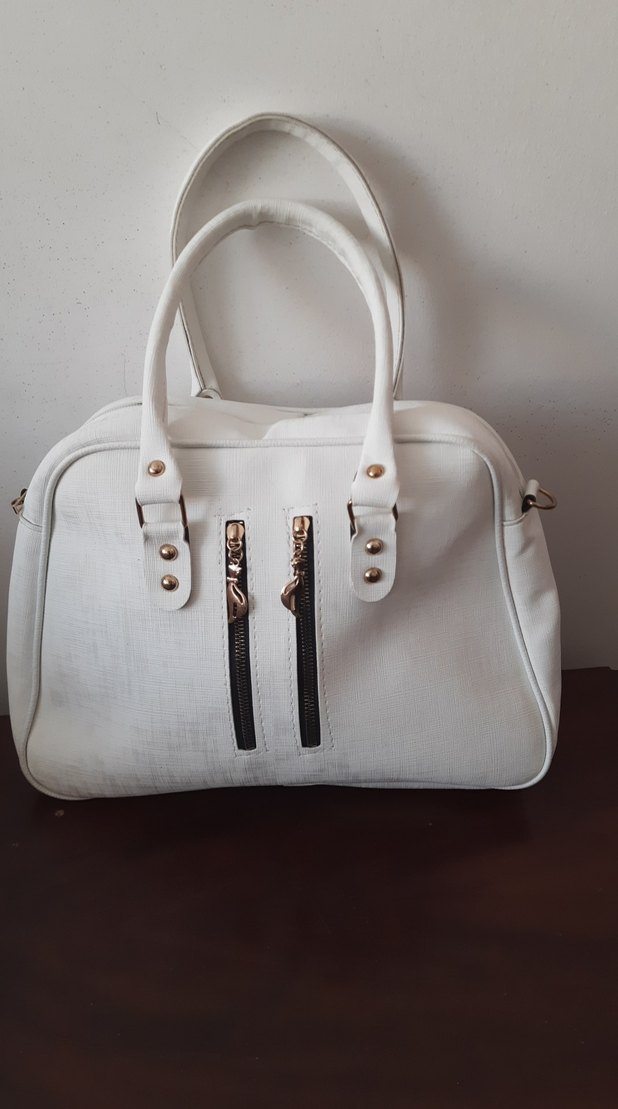 Beyaz deri kadın çanta, parlak yüzeyli ve minimalist tasarımlı. Önünde iki fermuarlı cep ve sağlam saplar bulunur, günlük kullanım için uygundur.