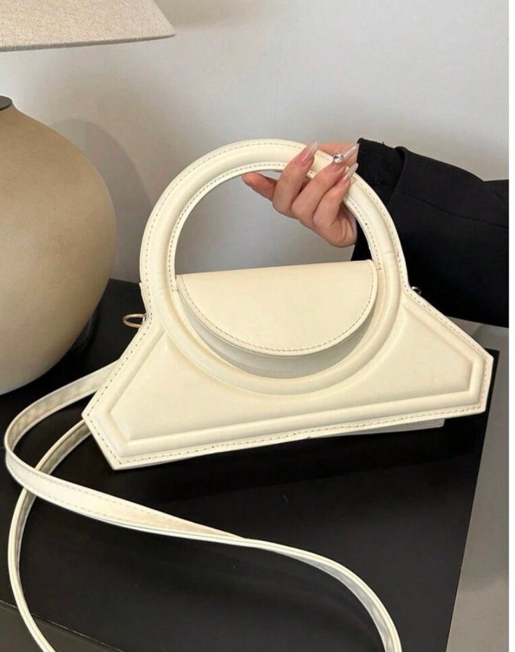 Beyaz deri kadın çanta, yuvarlak sap ve tokalı kapak detaylarıyla günlük kullanıma uygun modern ve şık bir tasarıma sahiptir. Desensiz, klasik Paris tarzını yansıtır.
