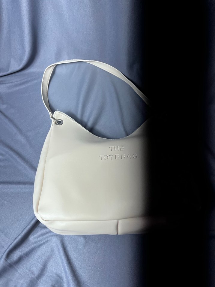 Minimalist tasarımlı beyaz deri kadın çanta, tek omuz askısı ve kabartmalı 'THE TOTEBAG' yazısı ile günlük sokak stiline uygun. Adet satılır İade kabul etmiyorum
