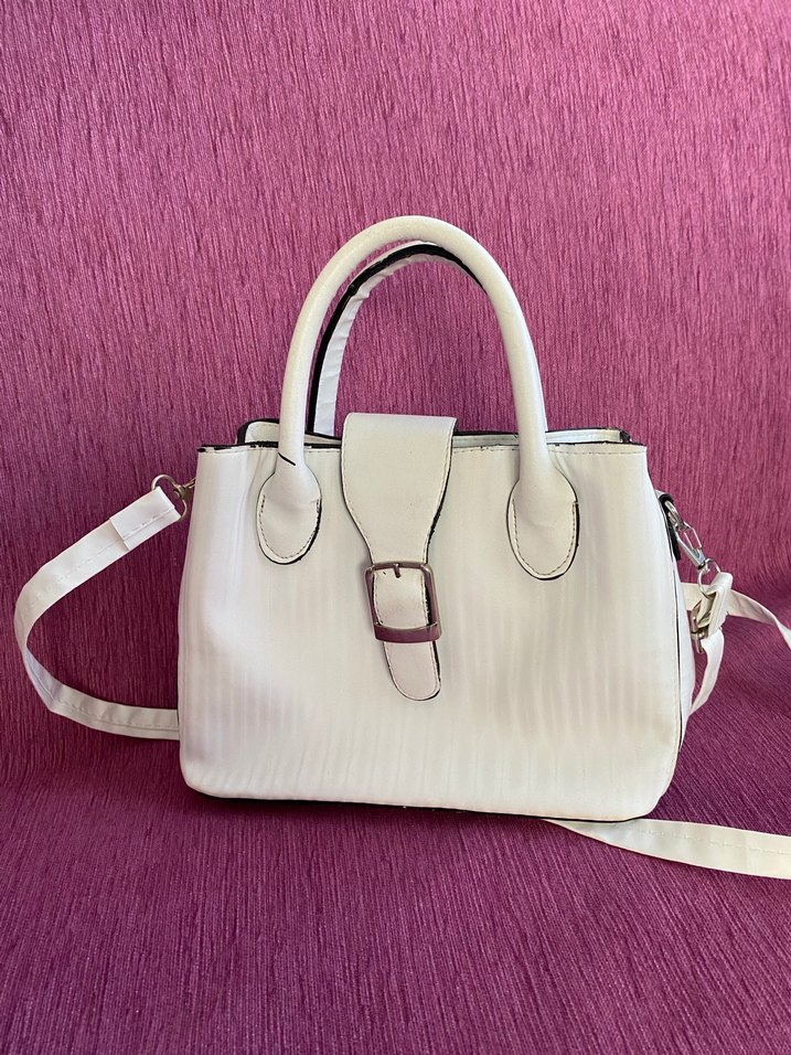 Beyaz deri kadın çanta, tokalı kapama ve minimalist modern klasik tasarıma sahiptir. Düz, desensiz ve pastel tonlardadır.