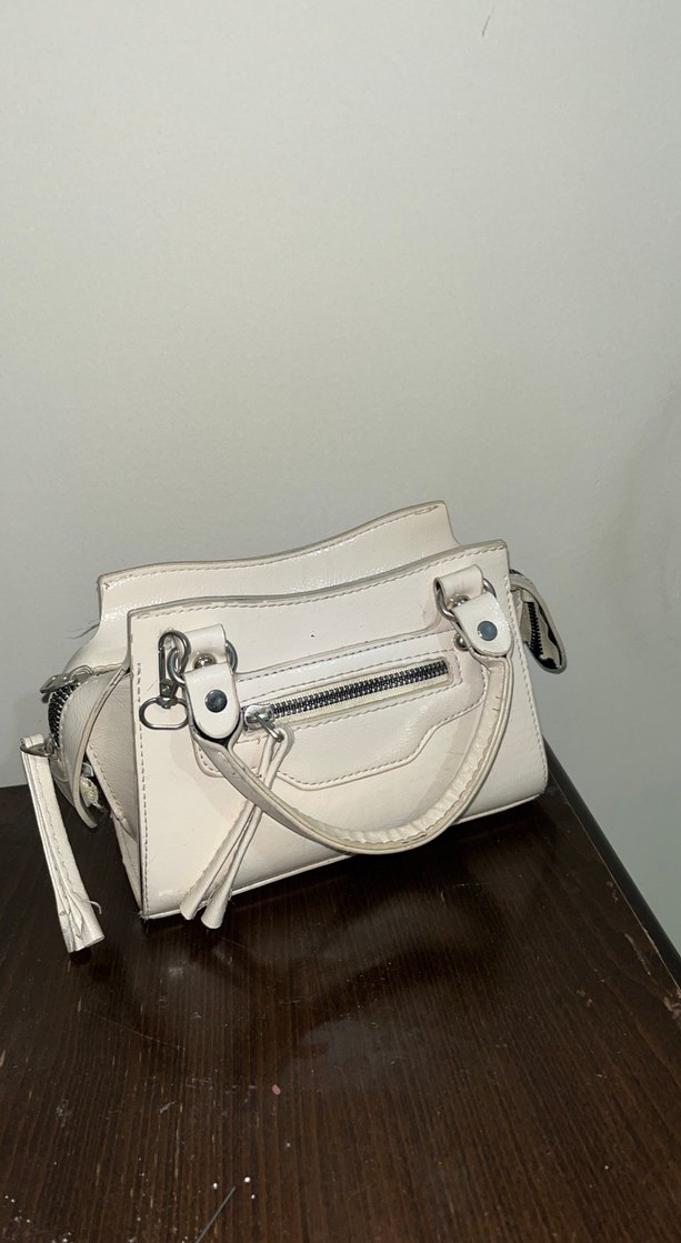 Bu beyaz deri kadın çanta, fermuarlı cepleri ve minimalist tasarımıyla dikkat çekiyor. Günlük kullanım için uygun, şık ve desen içermeyen bir modeldir.