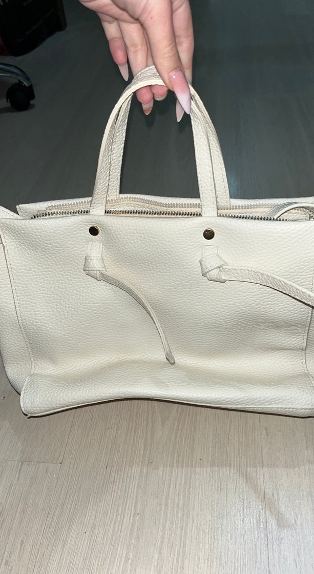 Beyaz deri kadin çanta, fermuarlı kapama ve desen içermeyen minimalist tasarıma sahiptir. Günlük sokak stili için uygundur.