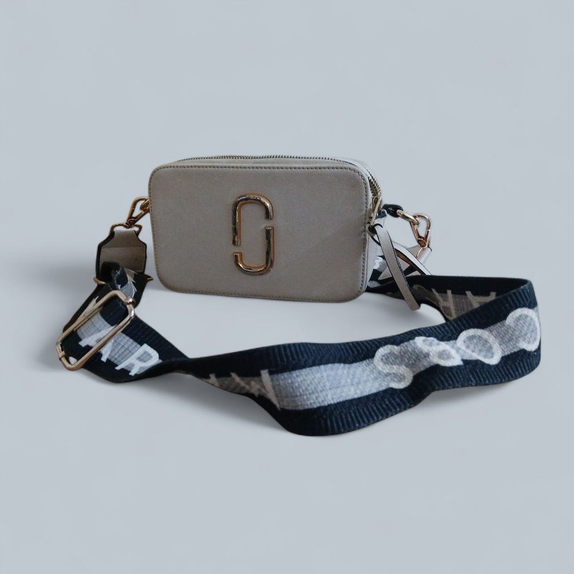 Beyaz deri kadın çanta, kemerli tasarım ve baskılı gri askı ile. Christinn Dior marka ve altın detaylar, trend sokak stili için uygun. ön Armasında renk degisimi var
