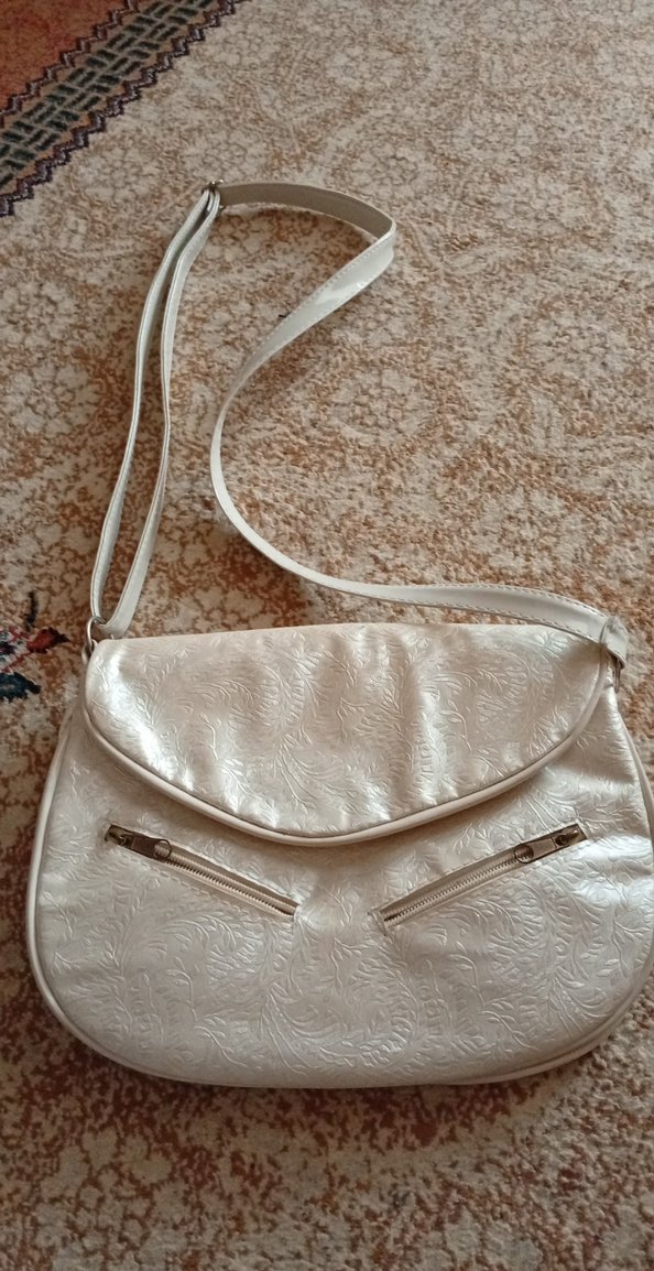 Beyaz deri kadın çanta, fermuarlı ceplerle ve parlak yüzeyle bohem tarzda. Günlük kullanım için sade, desensiz tasarım.