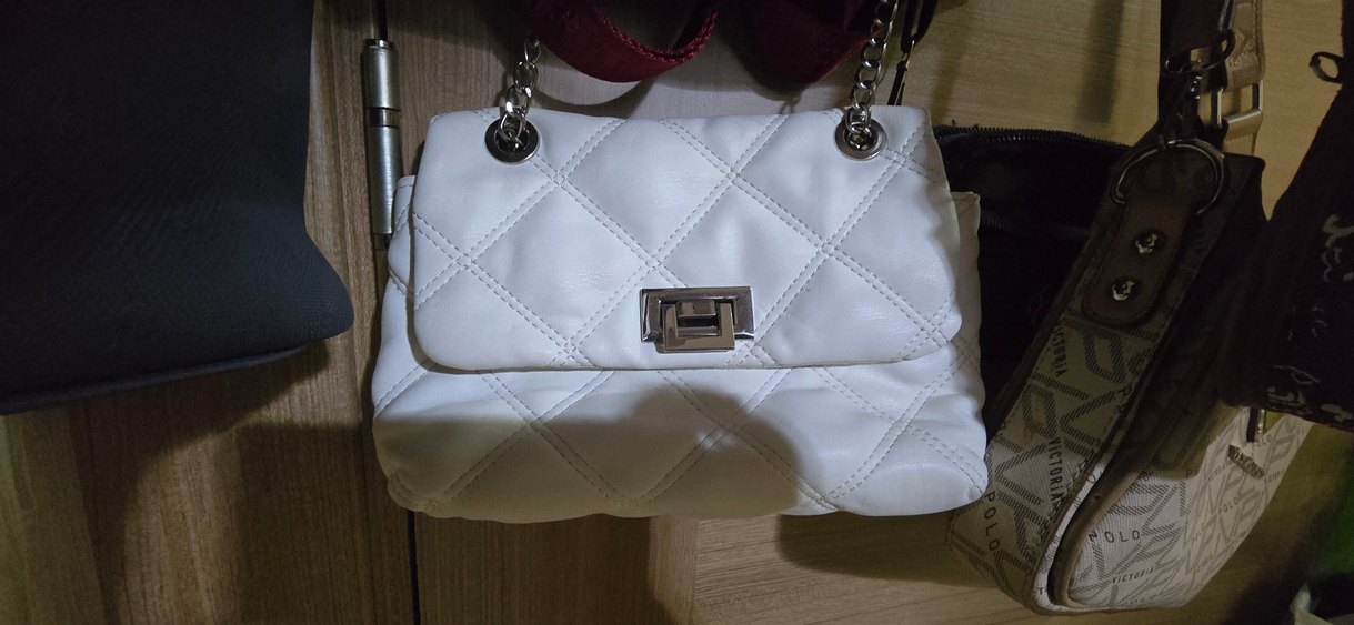 Beyaz deri kadın çanta, metal tokalı ve zincir saplıdır. Kapitone deseni modern klasik bir görünüm sunar. Günlük kullanıma uygundur ve Paris tarzı zarafet taşır.