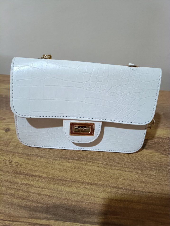 Beyaz deri çanta, yılan derisi desenli ve tokalı kapamalı. Minimalist ve klasik şıklığı bir arada sunar. Günlük kullanım için uygundur.