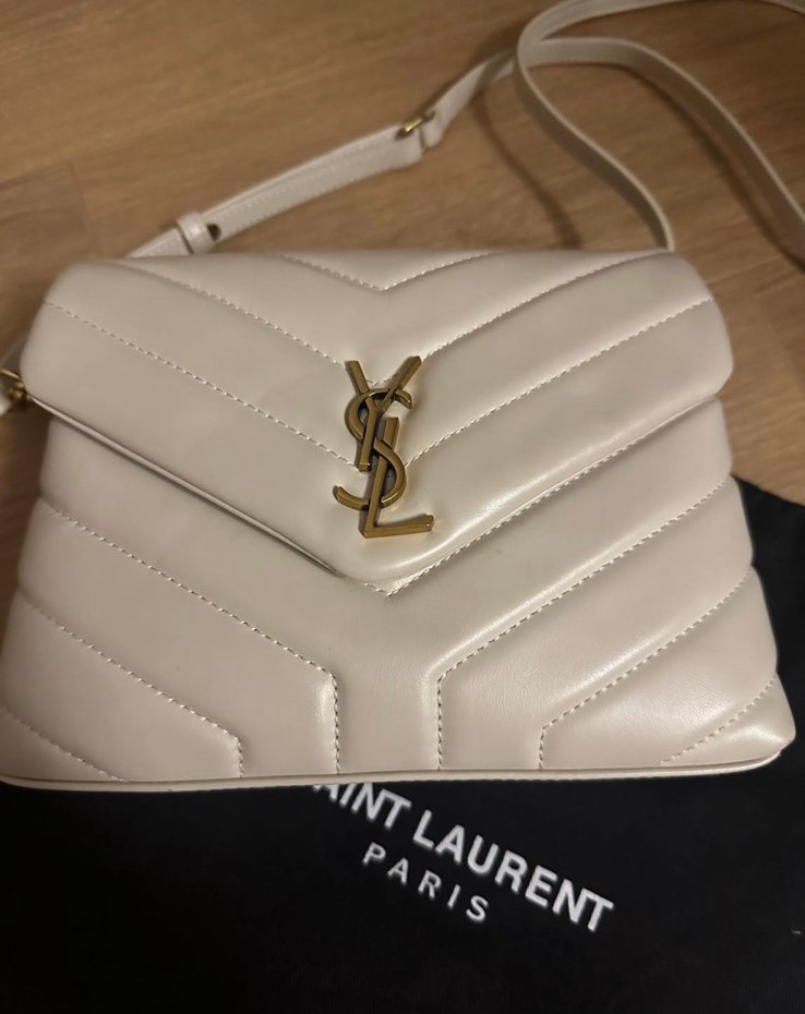 Beyaz deri kadın çanta, tokalı askı ve baskılı detaylara sahip. Klasik Parisian sokak stili ve YSL logosu ile gündelik kullanıma uygun.