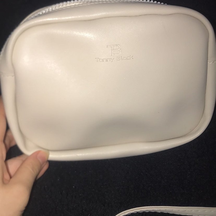 Beyaz deri kadın çapraz çanta, tokalı tasarım ve Tony Black'in minimalist baskılı logosuna sahiptir, günlük kullanım için uygundur. Minik bir leke mevcut