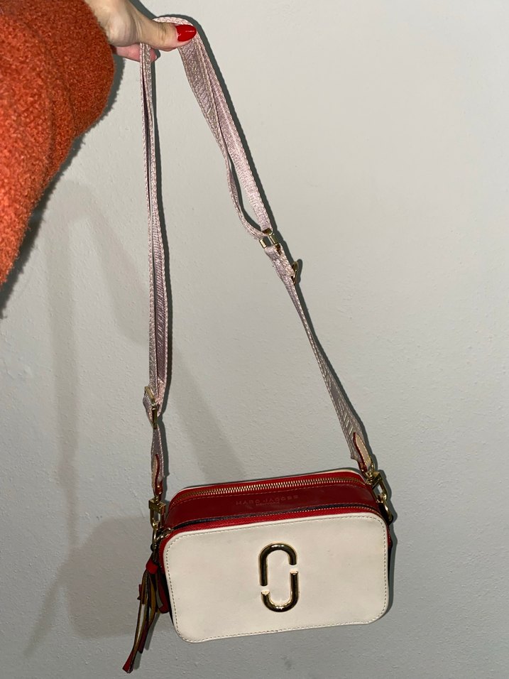 Beyaz deri çapraz çanta, fermuarlı ana bölme ve baskılı desene sahip. Günlük kullanıma uygun, ayarlanabilir askılı, trend sokak stili.