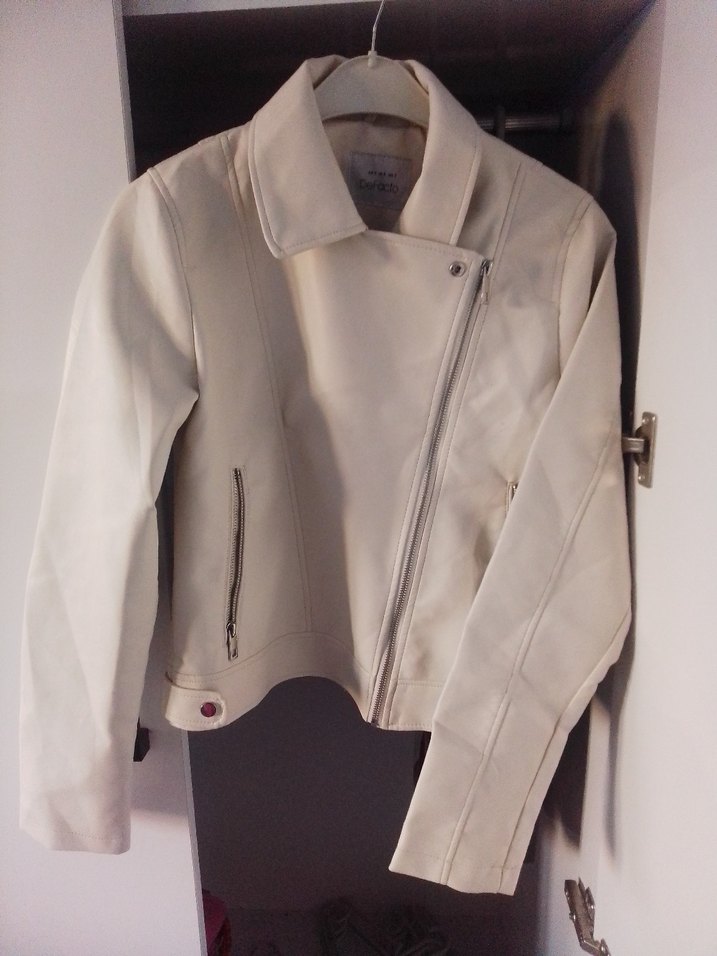 Beyaz deri ceket, fermuarlı ve kesik yakalıdır. Uzun kollu, midi boyda ve vücuda oturan kesime sahiptir, günlük kullanıma uygundur.
