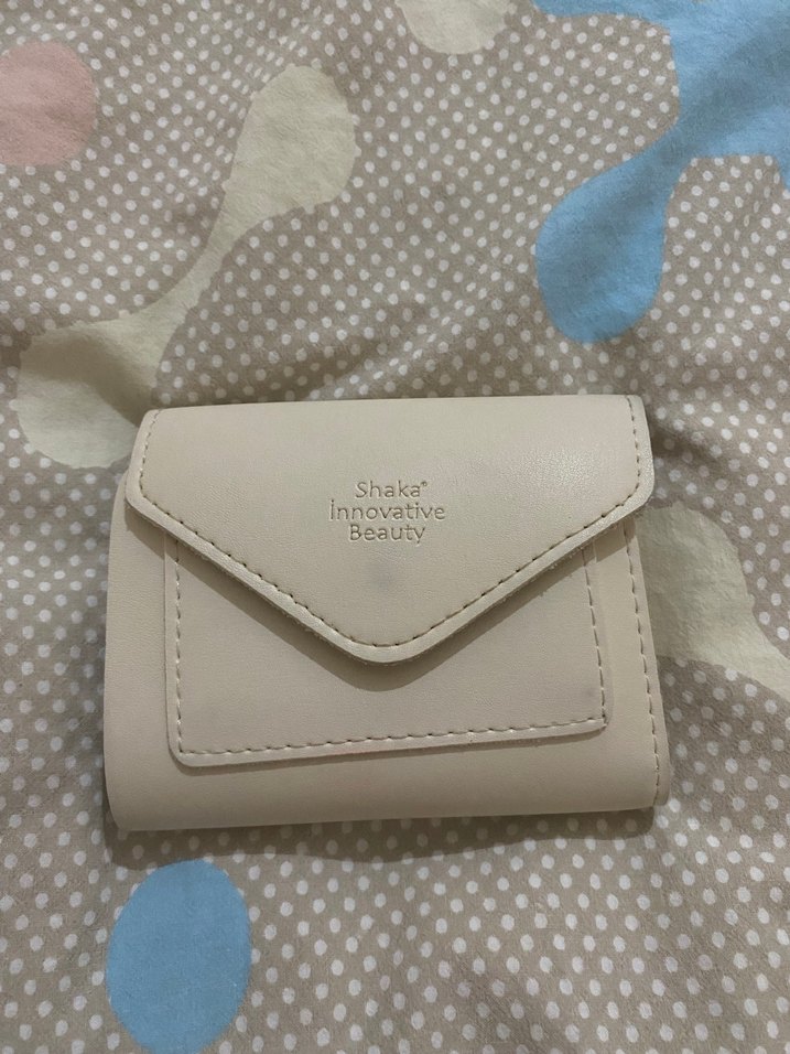Beyaz deri kadın cüzdanı, tokalı ve minimalist tasarıma sahiptir. Desensizdir ve günlük kullanım için uygundur. Üzerinde 'Shaka Innovative Beauty' yazısı bulunur.