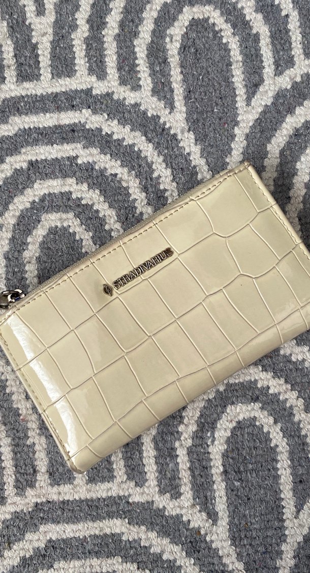 Beyaz deri kadın cüzdanı, fermuarlı ve yılan desenli. Klasik zarafetle sokak stilini birleştirir, günlük kullanım için uygundur.