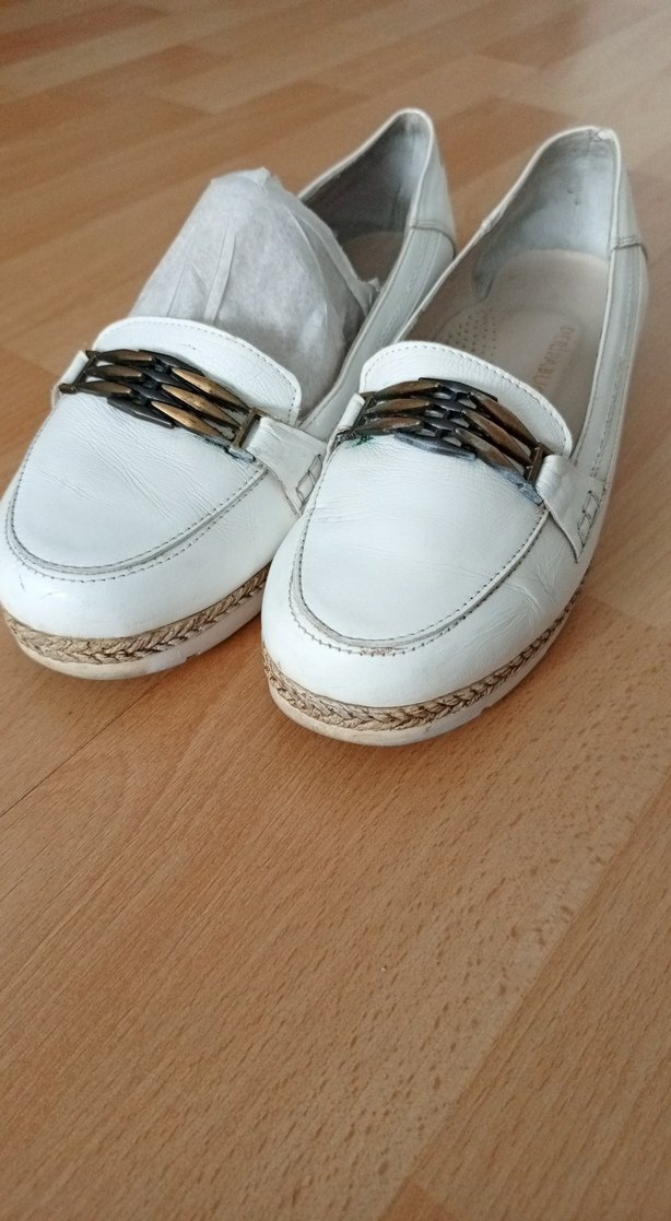 Parlak beyaz deri kadın espadril, dolgu topuklu ve tokalı detaylı, klasik zarafeti günlük rahatlıkla birleştirir. ( çok az kullanılmıştır gerçekleridir hiçbir sıkıntı sorun yoktur