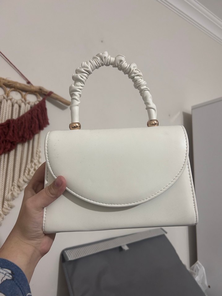 Büzgülü saplı beyaz deri kadın el çantası,minimalist ve modern klasik tasarıma sahip. Desensiz, pastel tonlarda, zahmetsiz şıklık sunar.