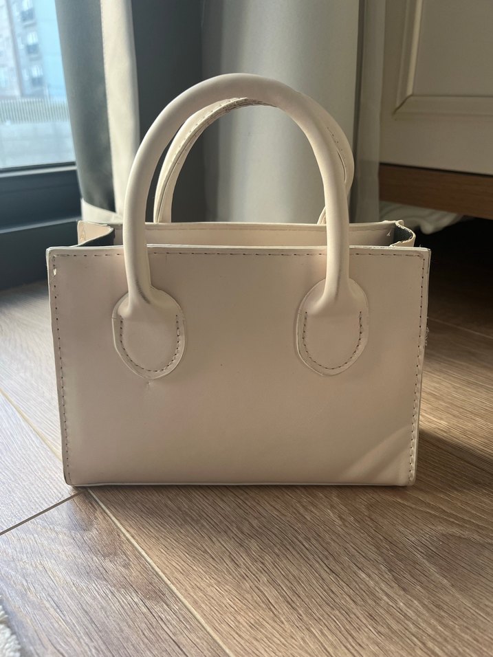 Beyaz deri kadın el çantası, pastel tonlarda sade ve çağdaş tasarıma sahiptir. Günlük kullanım için uygundur ve desen içermeyen şık bir görünüm sunar.