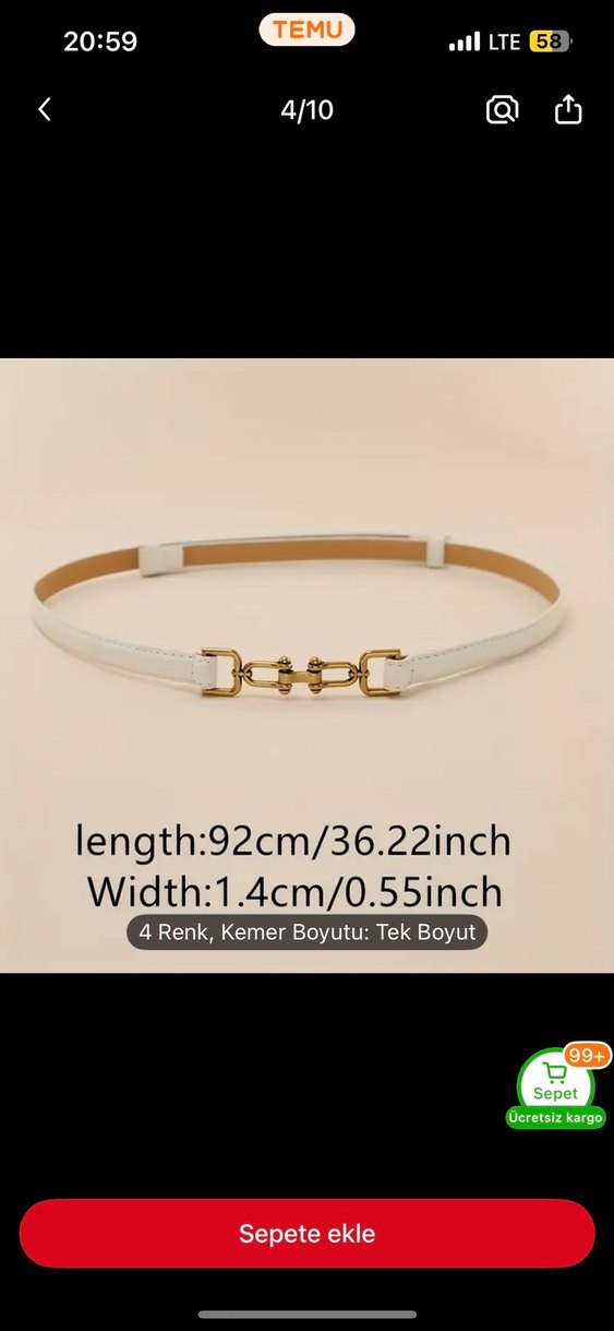 Altın tokalı beyaz deri kemer, 92 cm uzunluğunda ve 1.4 cm genişliğinde, minimalist sokak stili için uygun. Dört renk seçeneği bulunur.