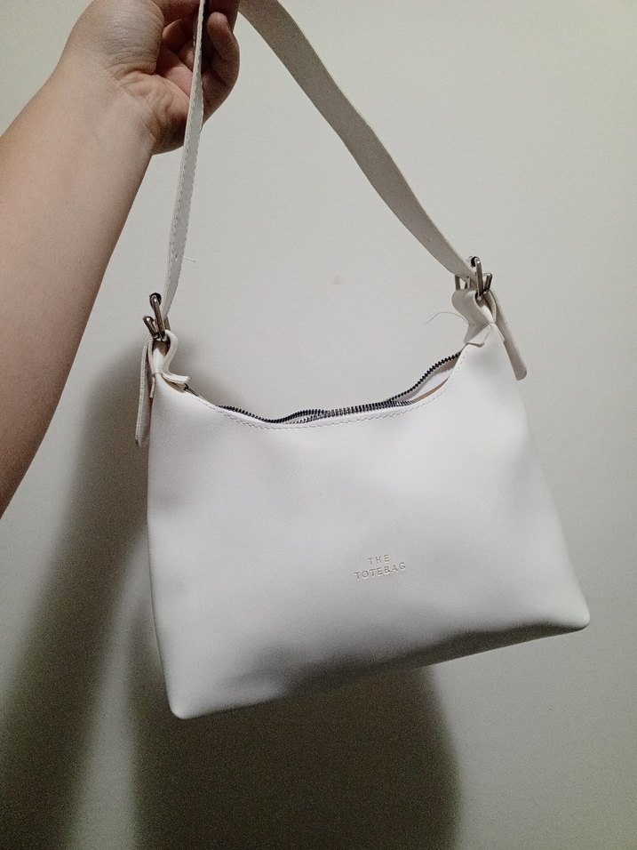 Beyaz deri, tokalı askılı, desen içermeyen minimalist kadın çantası. Günlük sokak stiline uygun pastel tonlarda.
