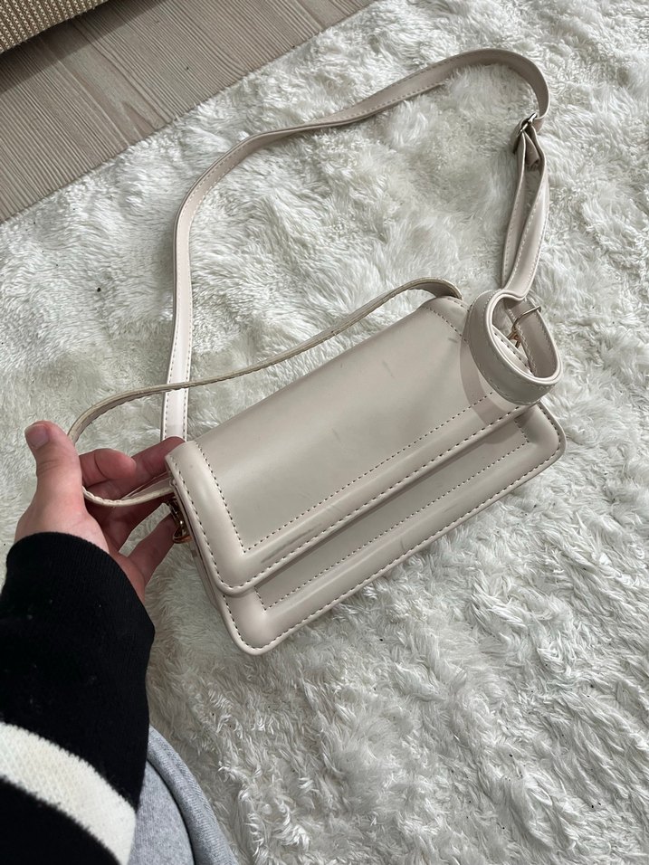 Pastel tonlarda beyaz deri omuz çantası, tokalı kayışa sahip, günlük kullanım için modern klasik tarzda.