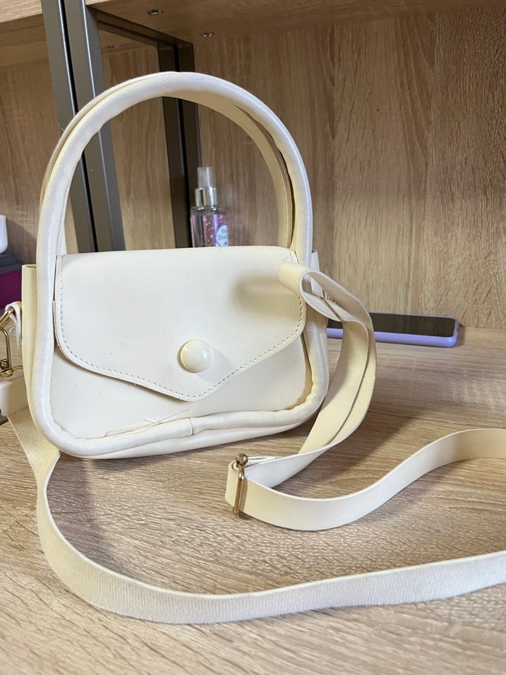 Beyaz deri omuz çantası, tokalı kapak ve çıkarılabilir askıyla sade, çağdaş tasarıma sahiptir.